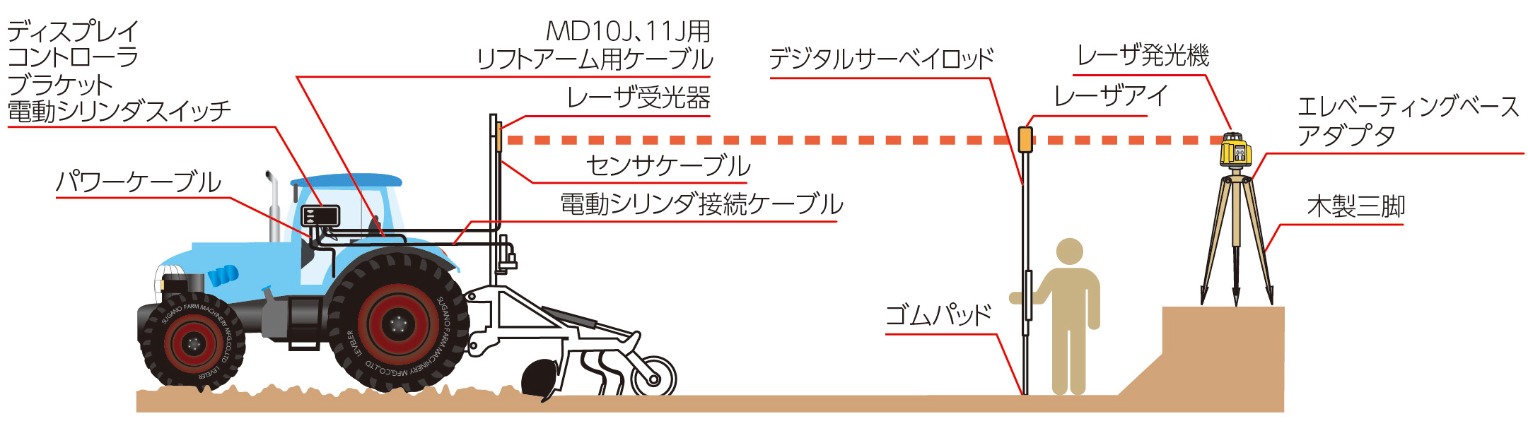 トラクタの3点ヒッチに装着したレベラ作業機上に設置したレーザ受光機の信号を受け、自動で高さの制御を行い、容易に圃場を整地(水平均平、勾配均平)する装置です。特に稲作の省力化を図る技術として注目されている直播栽培においては多大な効果を発揮します。現在は殆どのトラクタに装着が可能であり直送レベラにけん引レベラを加え、日本全国で活躍しています。